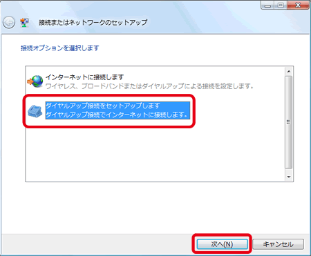 5.[ダイヤルアップ接続をセットアップします] をクリックし [次へ] をクリックします。